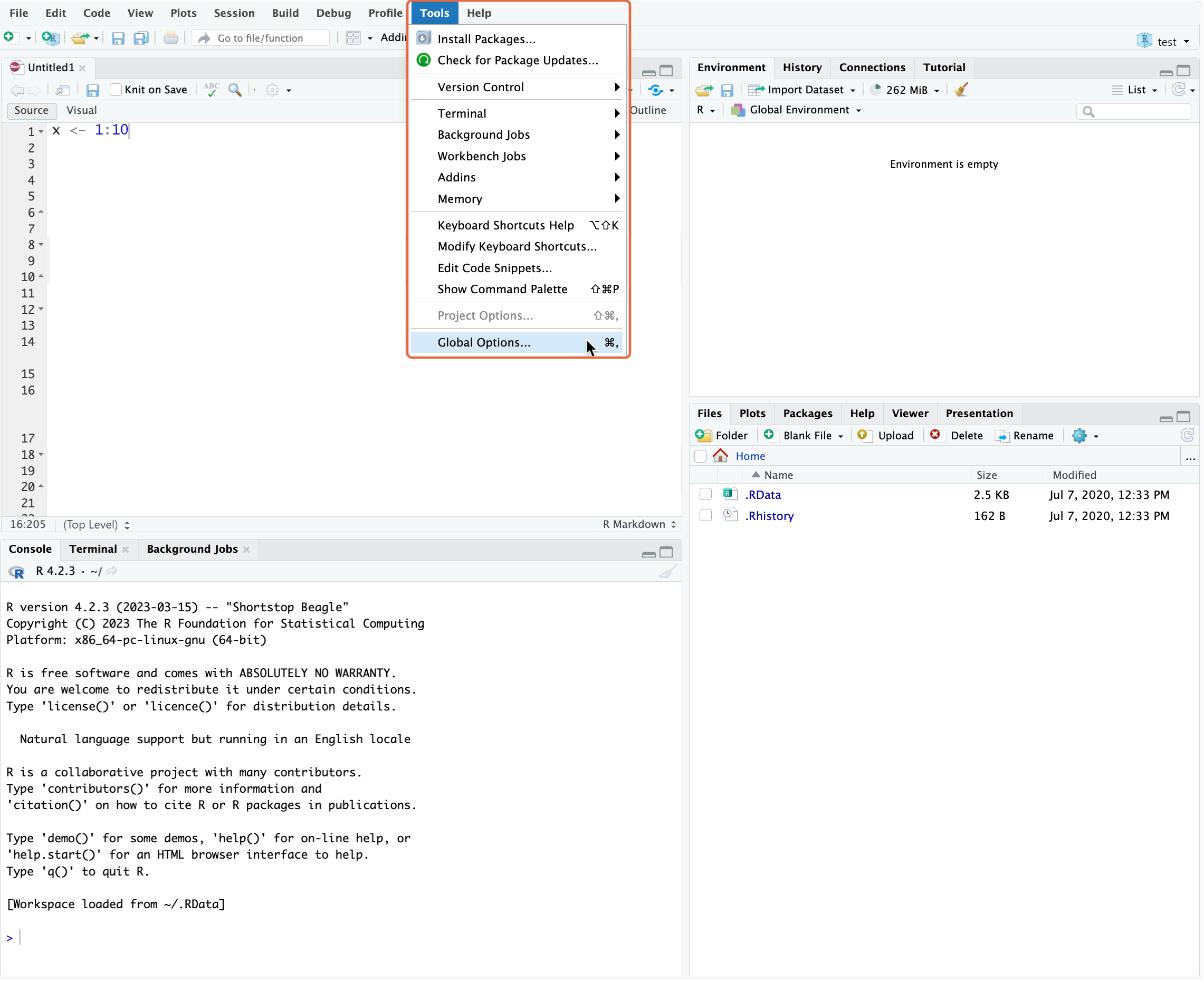 In RStudio Desktop or Posit Workbench, repository settings are configured through the Global Options menu available from the Tools section of the main toolbar.