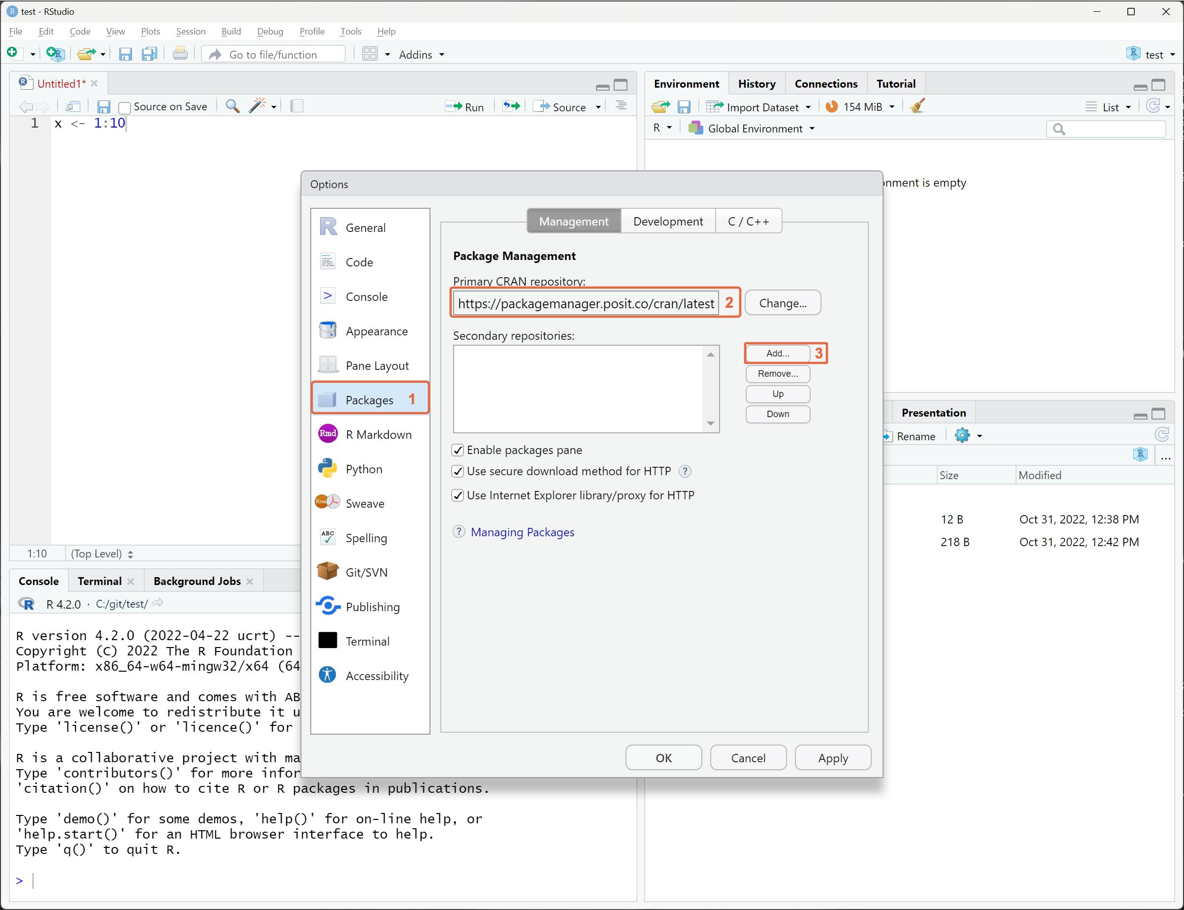 From the left pane, click Packages , paste the repository URL into the Primary CRAN repository field or click Add to include this repository as a secondary repository.