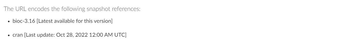 When you get an encoded URL, Package Manager provides you with information about what the encoded URL contains. For example, the screenshot below shows a URL from a repository that contains two sources, CRAN and bioc-3.16:
