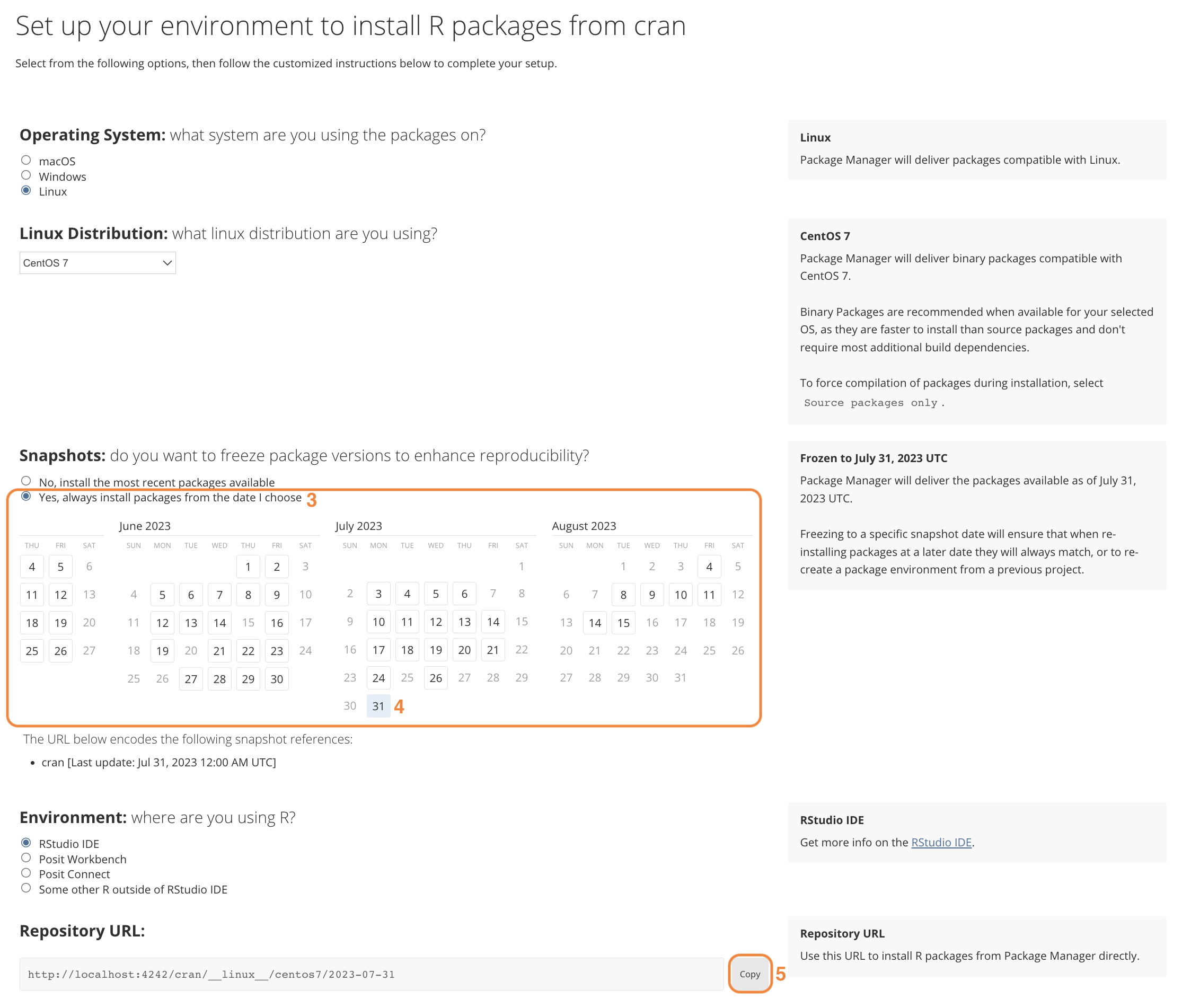 - In the Snapshots section, select the Yes, always install packages from the date I choose option. .
