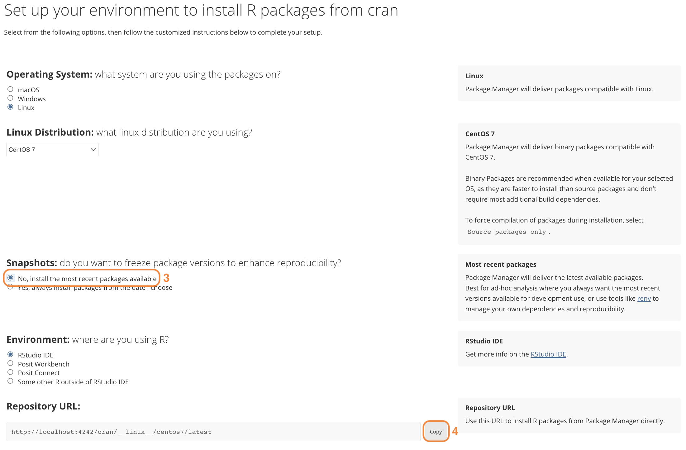 Package installation tools in R and Python are typically configured, by default, to access packages from one or more public package repositories, such as CRAN, Bioconductor, or PyPI. To install packages from Package Manager, your environment must be reconfigured by changing the repository URL in your client.