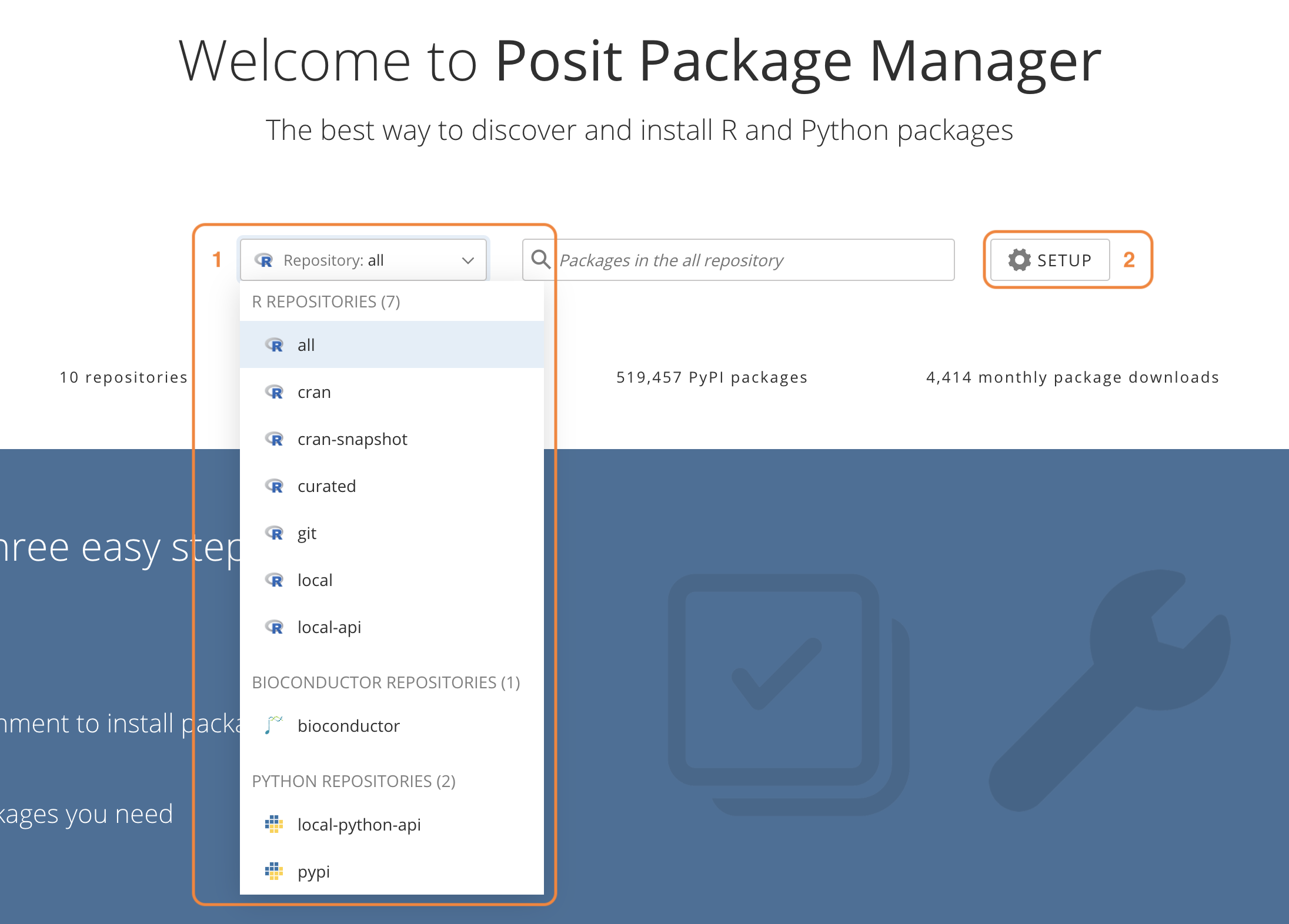 - From the top of the Package Manager home screen, select a repository from the list and then click SETUP .
