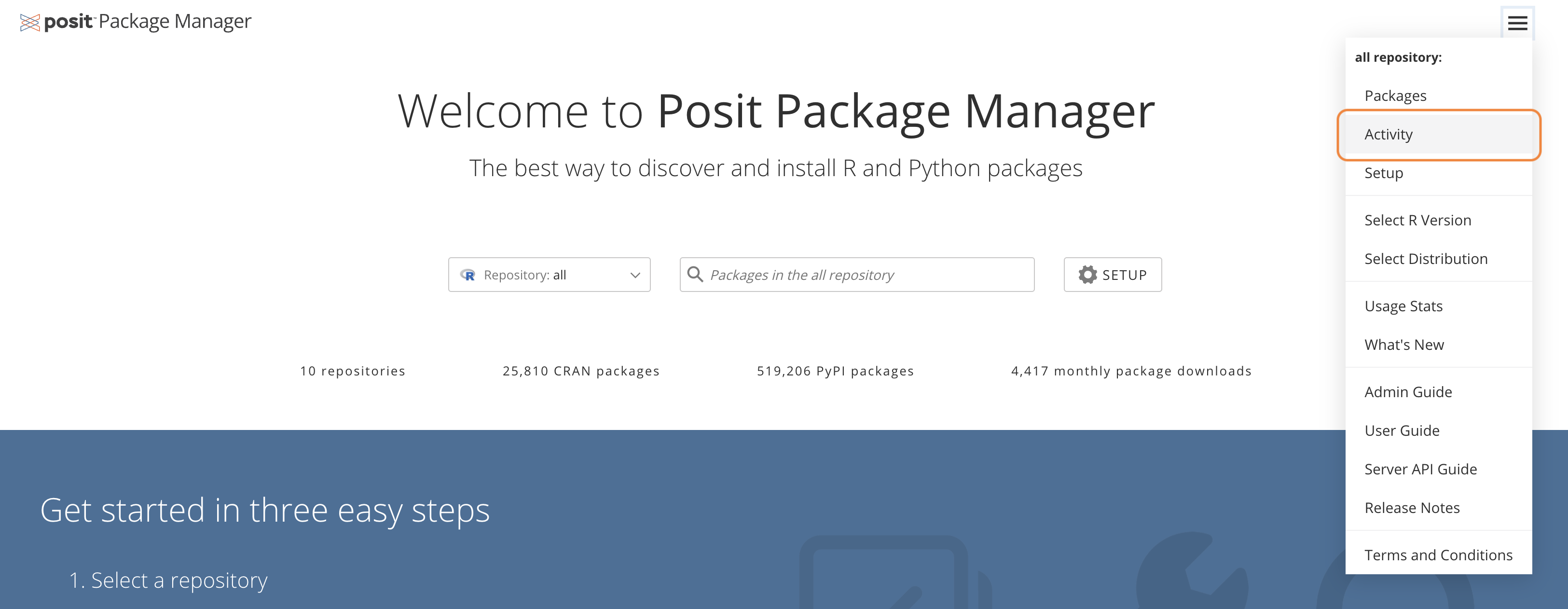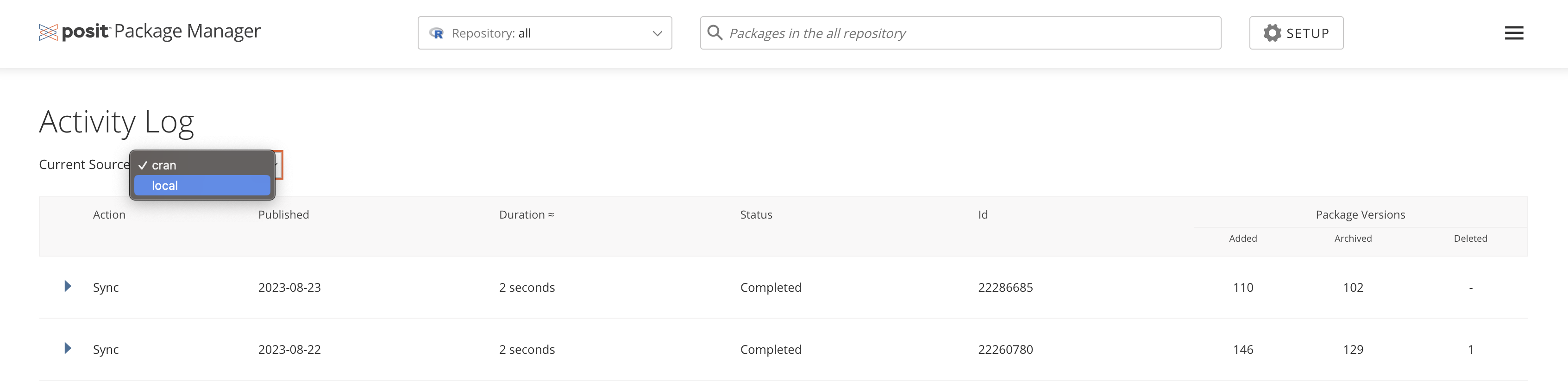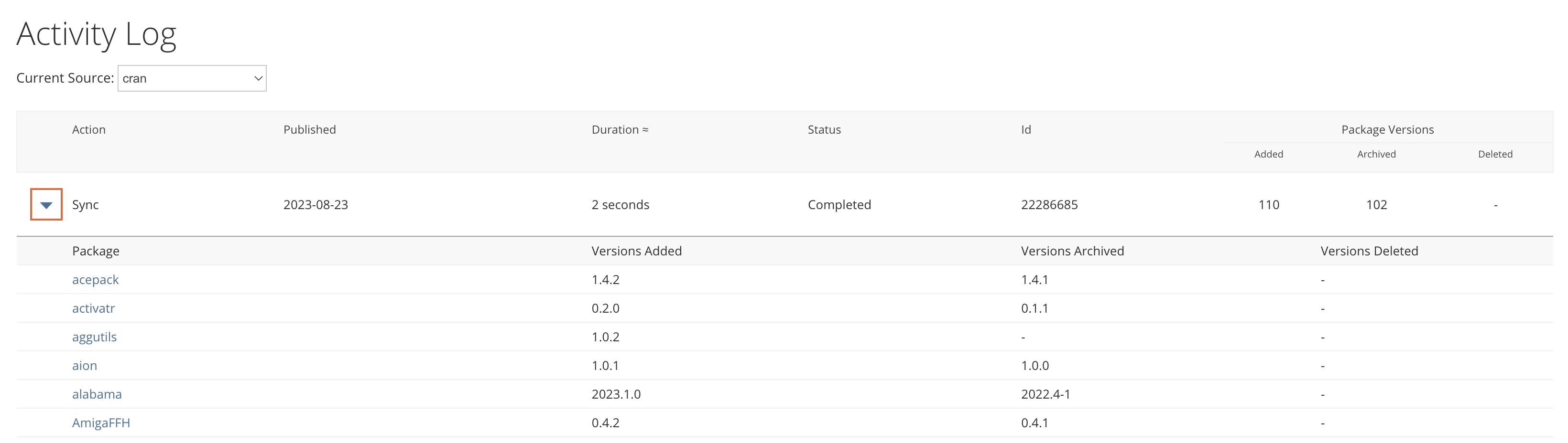 For public sources (CRAN, Bioconductor, and PyPI) package updates are synced every business day from the Posit Package Service. These appear as a "Sync" action in the Activity Log.